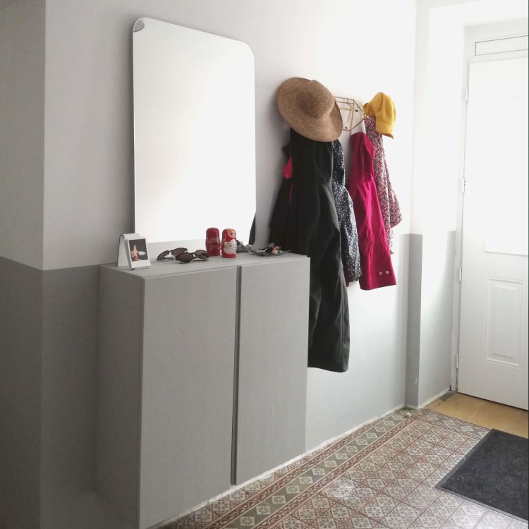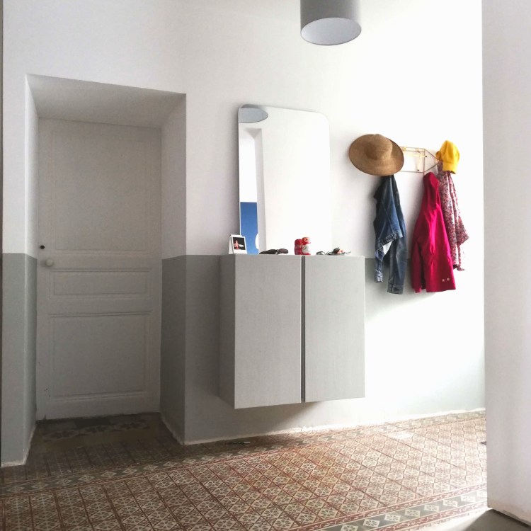 Un meuble suspendu, ton sur ton avec le mur, permet de structurer l’espace et d’offrir une solution de rangement pratique sans alourdir le volume. Il est accompagné d’un miroir au design épuré, qui agrandit visuellement l’espace et reflète la lumière naturelle. Un porte-manteau chiné complète harmonieusement l’ensemble, ajoutant une touche de charme rétro tout en répondant aux besoins du quotidien.