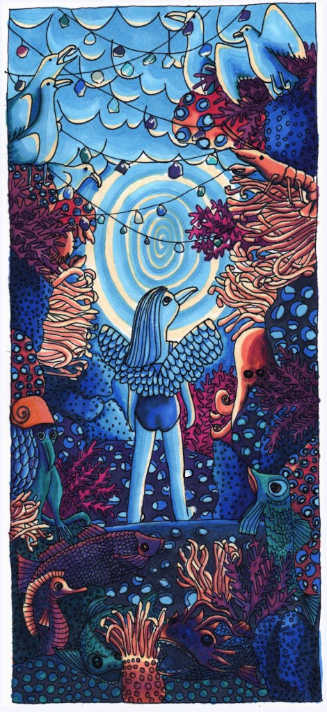 Cette vitrine onirique évoque un univers marin mystique où un oiseau chimère, au cœur d’un fond infini illuminé, répond à l’appel de la déesse Hora. Les guirlandes de verre scintillantes et les détails foisonnants de coraux et de créatures marines créent une scène poétique mêlant spiritualité et richesse des océans.